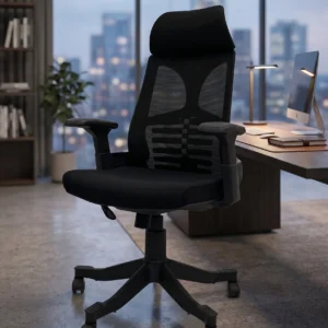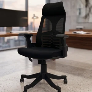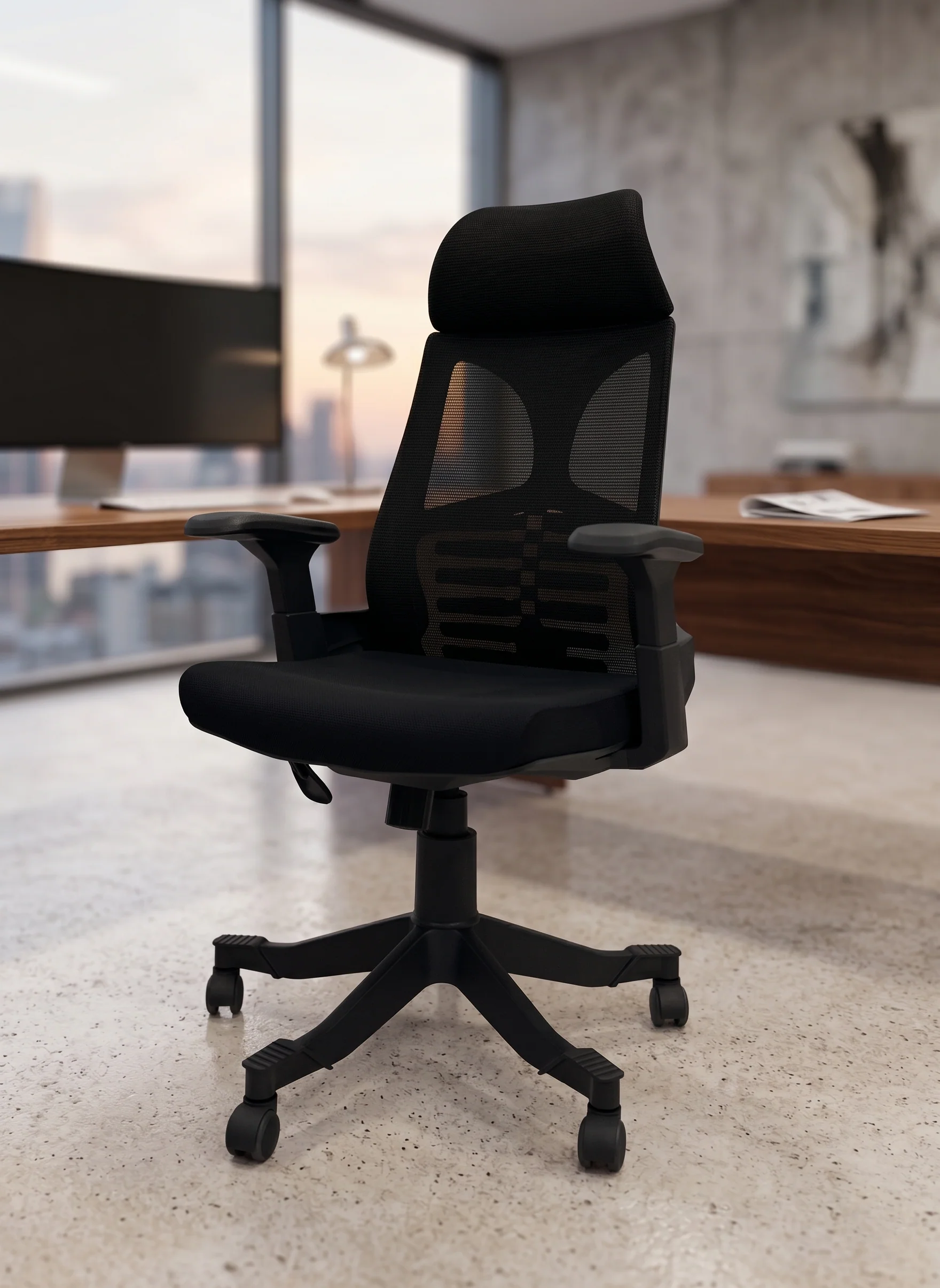 The Best Office High Back Chair in market. Make your sitting time more special and comfortable with our B-545 Skelton Executive Revolving Chair With Fixed Arms & Head Rest. Provide you lumber support and head support. Suits your office decor easily. This chair follows all the principals of ergonomics and ensures full support of the body. The rigid mesh provide extra support to your back and a proper air circulation that gives comfort to your back.