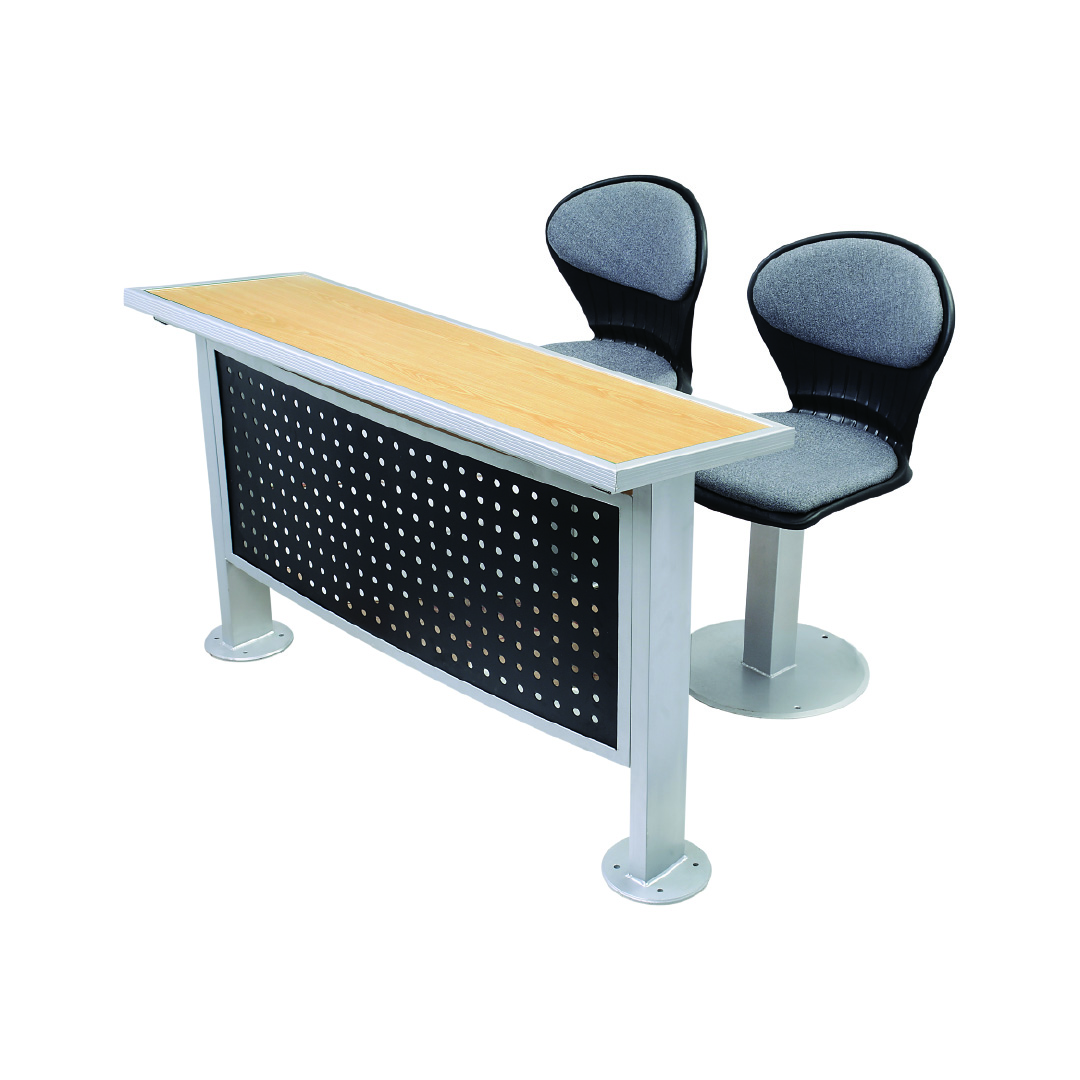 Boss 2-Seater Iron Frame and Wood Desk and Pecock Shell Revolving Chairs with cushions and base plate. Best sitting solution for receptions, schools and colleges. Strong, durable and long lasting.