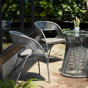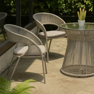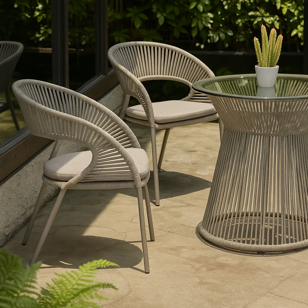 Elegant Rope Design: Handwoven all-weather rope adds modern texture and breathability to the chairs.