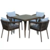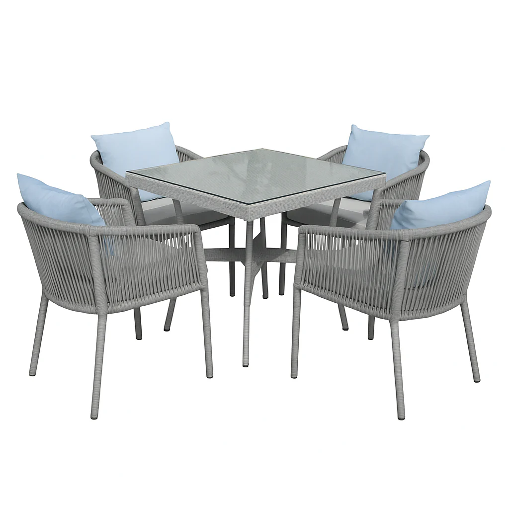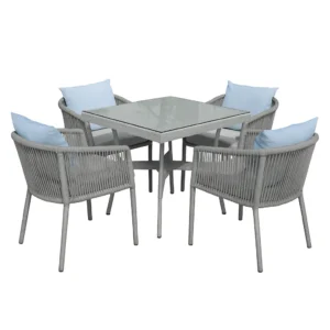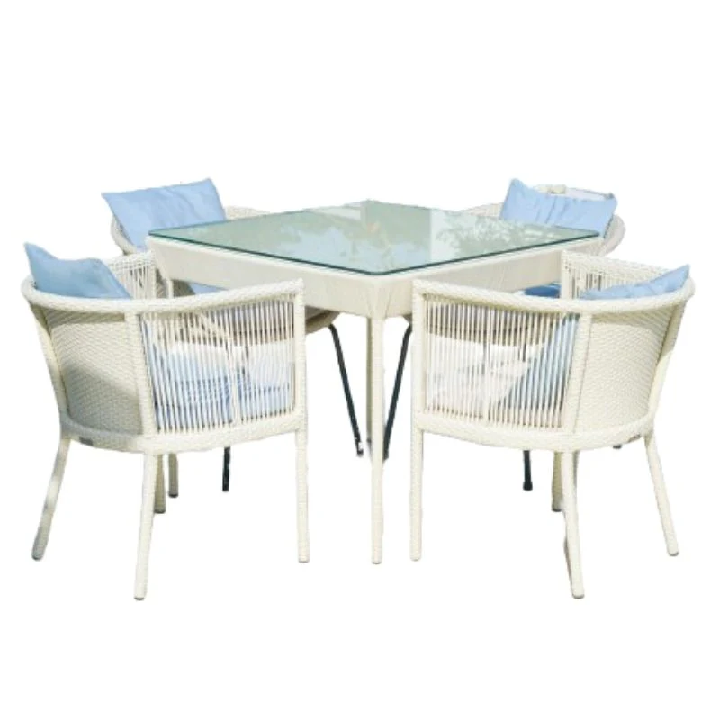 Bring Coastal Breeze to your patio with the Coastal Breeze Dining Set. Featuring 4 cream-finished rattan chairs with soft blue cushions and a 32″x32″ glass-topped table, this set offers relaxed elegance perfect for al fresco meals and coastal vibes.