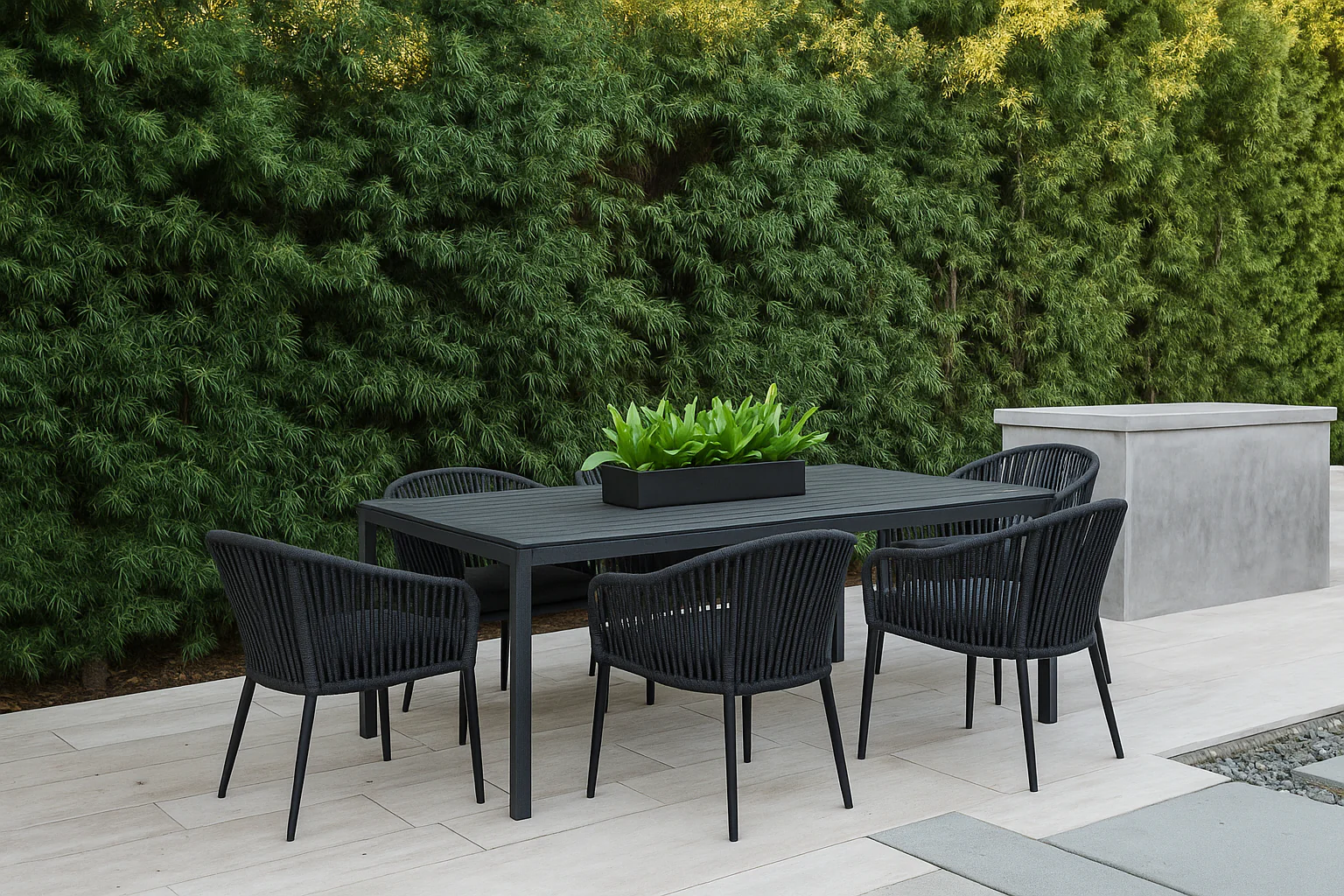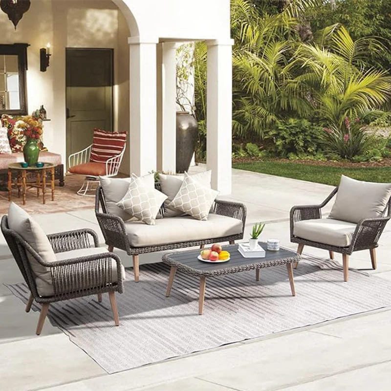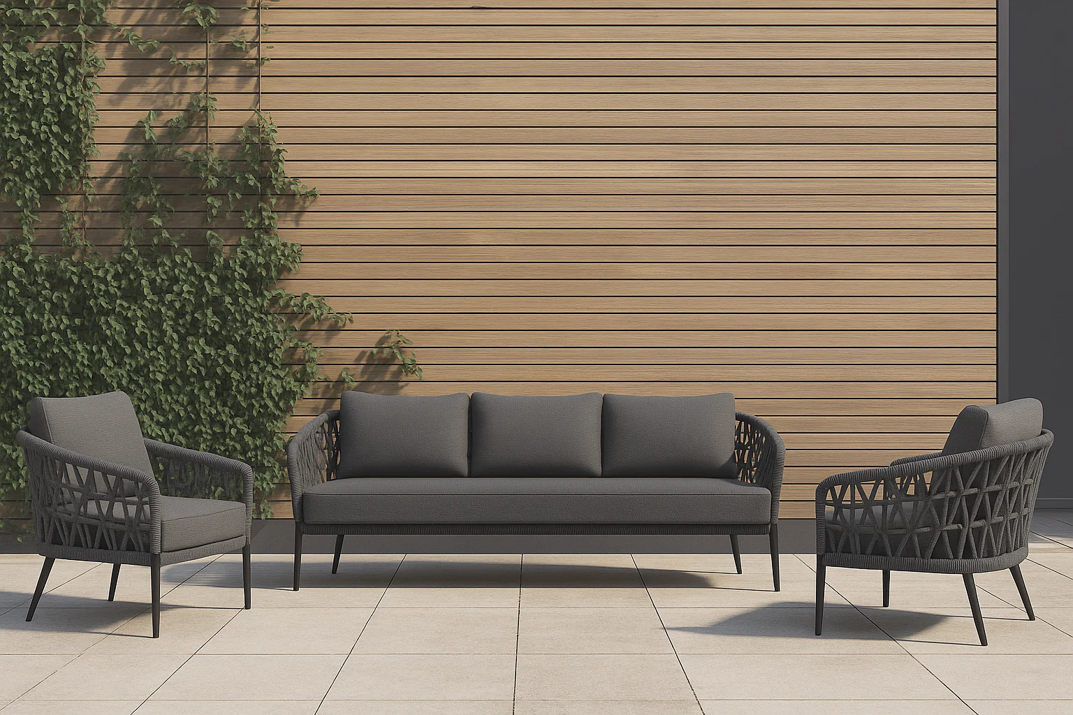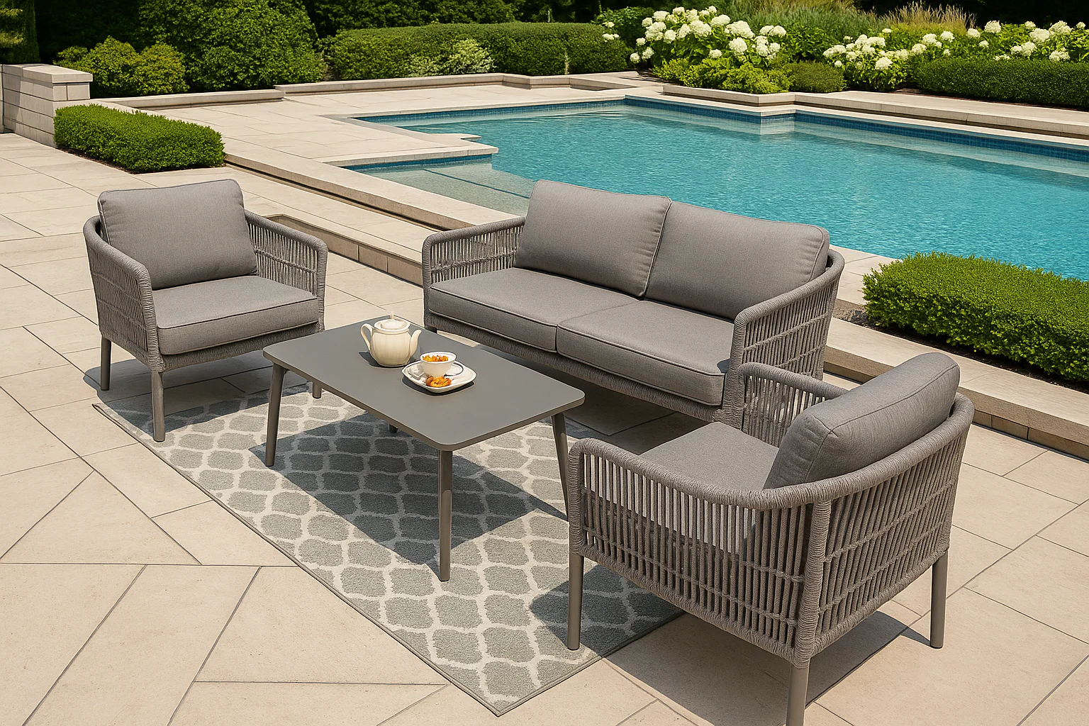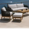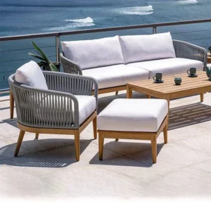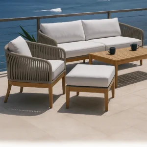 Indulge in laid-back luxury with the Coastal Haven 5-Piece Outdoor Lounge Set, crafted to bring a touch of seaside serenity to your patio or terrace. Featuring a spacious 3-seater sofa, two stylish single chairs, a versatile ottoman, and a sleek 2′ x 3.5′ red meranti wood coffee table, this set blends contemporary rope detailing with warm, natural teak for a harmonious outdoor aesthetic. Designed for comfort and durability, it’s ideal for lounging, entertaining, or soaking up ocean breezes.