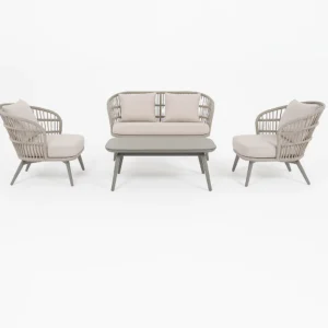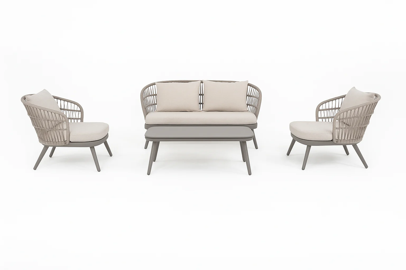 Elevate your outdoor space with this elegantly designed 4-piece Modern Outdoor Lounge Set. Crafted with a perfect blend of comfort, style, and durability, this set features a 2-seater sofa, two single-seater sofa, and a sleek rectangular coffee table topped with a luxurious marble surface. The neutral-toned cushions offers elegant seating experience while complementing any patio or garden aesthetic.