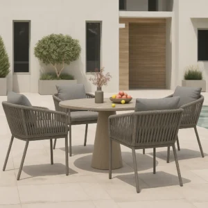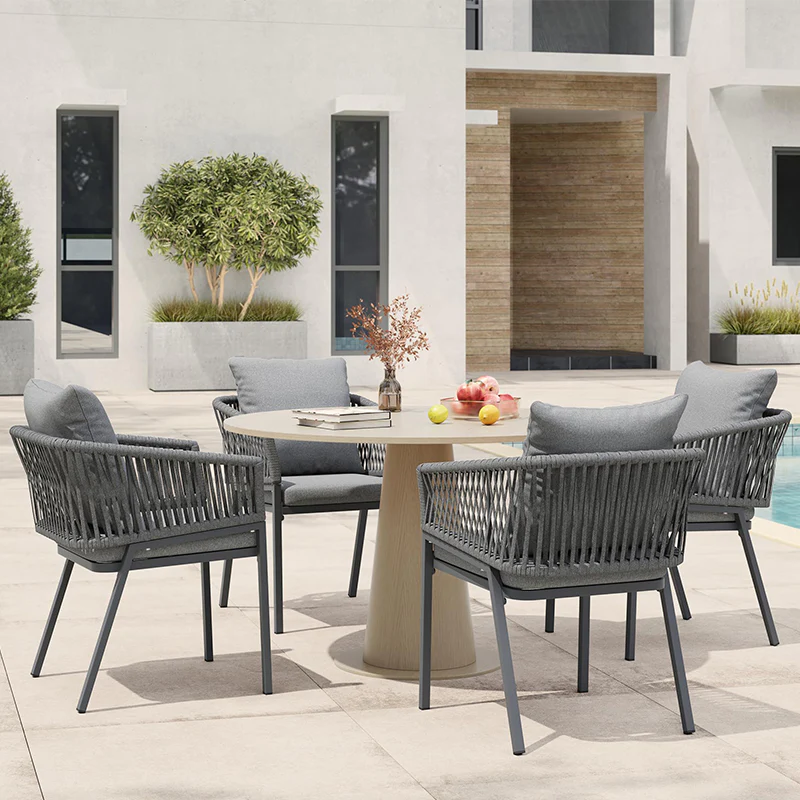 Sophisticated, stylish, and built for modern outdoor living, the Monaco Round Dining Set brings resort-level elegance to your patio or poolside space. This 5-piece ensemble includes a 36-inch round marble-top dining table paired with four rope-wrapped armchairs, featuring plush cushions for unmatched comfort. Its contemporary design and durable construction make it the perfect set for entertaining or enjoying relaxed outdoor meals.