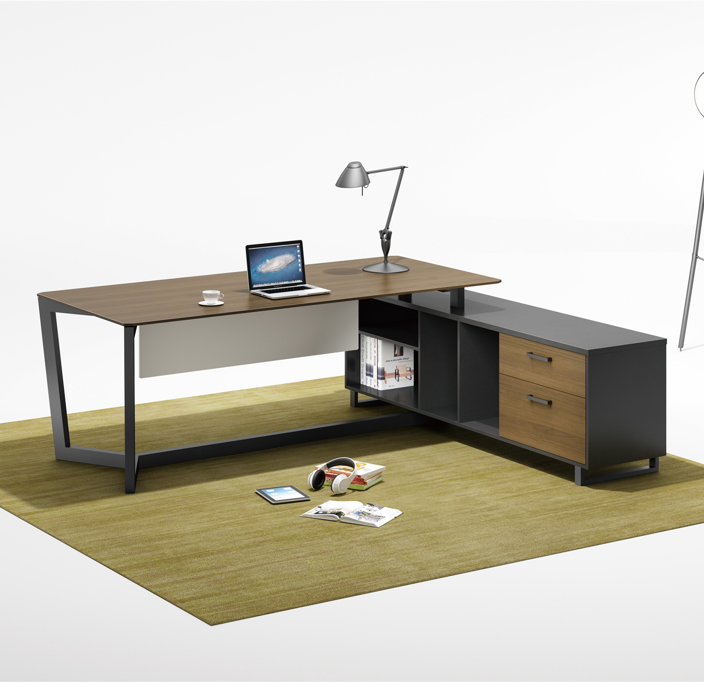 - L-shaped table with attached Side Rack