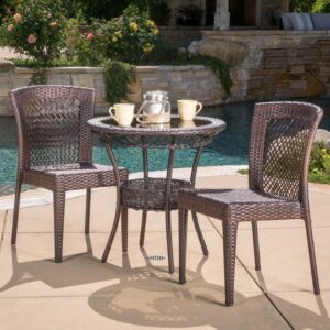 The Coffee Set with 2 Chairs & 2′ round Table offers a cozy and intimate setting, perfect for quiet afternoons by the pool. It includes two high-back chairs with a dark rattan weave and a matching round table with a glass top, ideal for smaller spaces or cozy corners. Perfect for enjoying tea or a sunset drink, this set exudes elegance and tranquility.