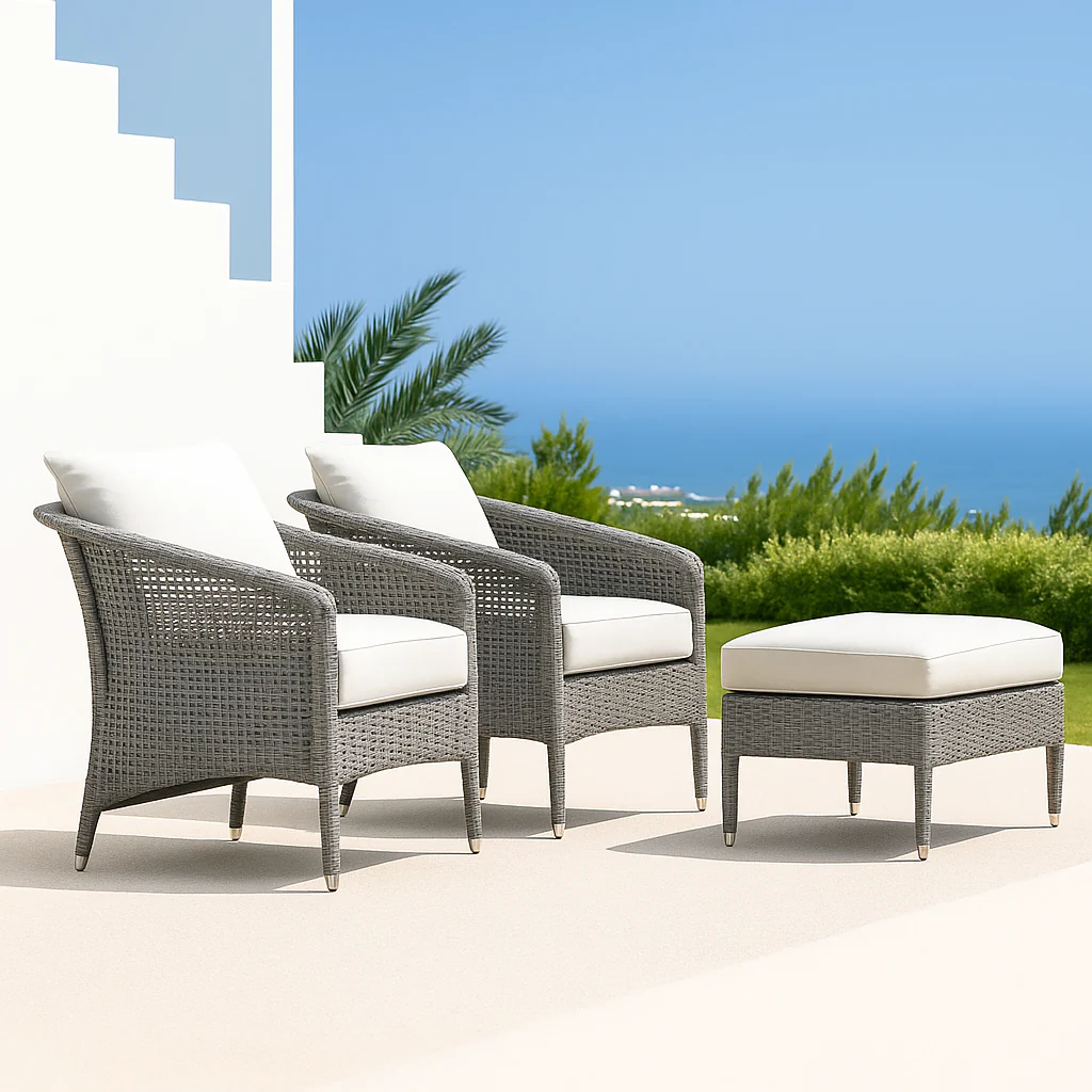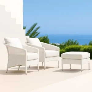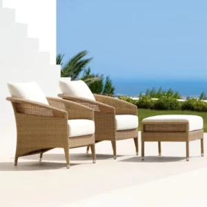 Embrace the tranquil coastal vibe with this elegant rattan seating set, perfect for creating a serene outdoor retreat. The sun-kissed rattan weave and cushions ensure a relaxing and stylish experience, whether you’re lounging by the beach or in your garden.