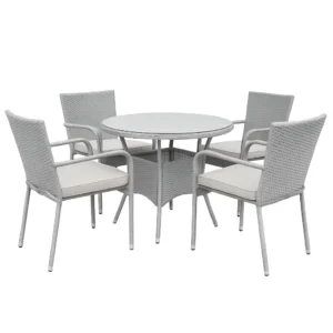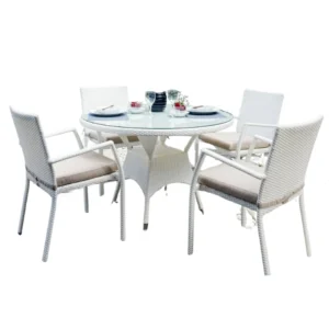 The Starlight White Patio Dining Set shines with pristine simplicity and modern charm, ideal for enjoying outdoor meals in style. Featuring four armchairs with sleek white rattan construction and comfortable cushions, this set exudes elegance. At the center, a round-shaped white rattan table with a round glass top adds a unique, contemporary flair. Perfect for leisurely breakfasts, sunny lunches, or dinner under the stars, this set transforms any outdoor space into a dining haven.