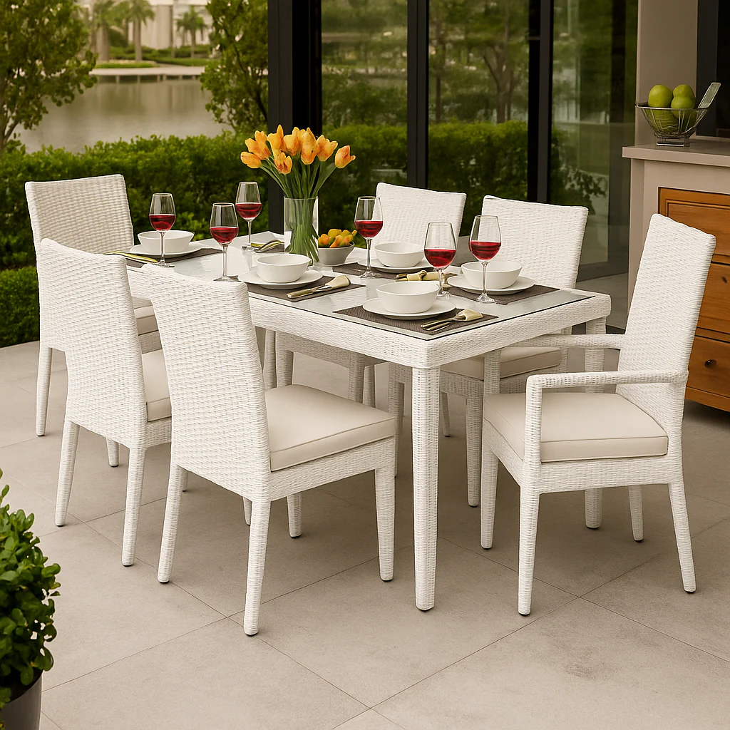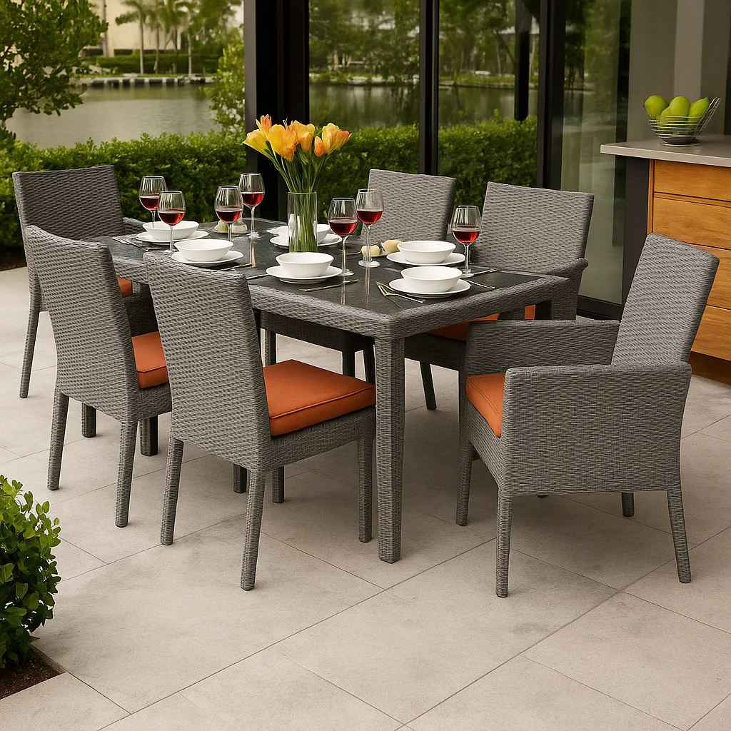The Monterra Luxe Dining Set is perfect for outdoor dining with a 5’x2.6′ table and six chairs, all made from durable dark brown rattan. The terracotta cushions provide a warm contrast, while the glass tabletop ensures easy cleaning. Ideal for dinner parties or family meals, this set adds rustic elegance to any outdoor space.