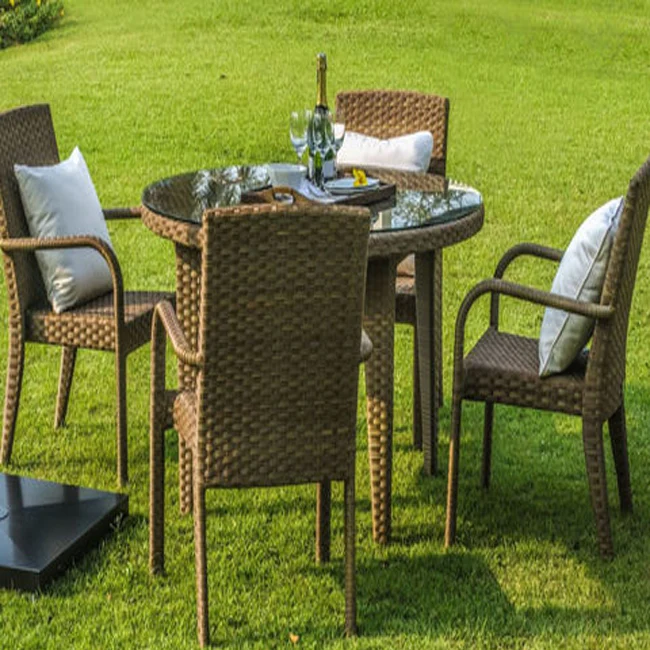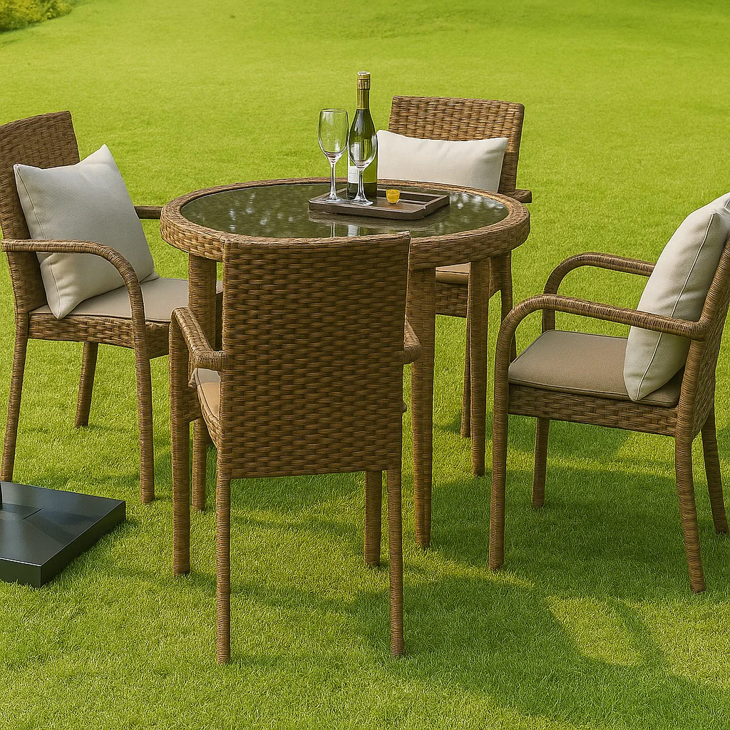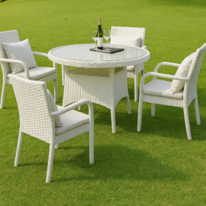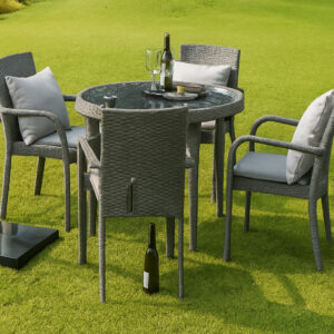 Bring the charm of vineyard dining to your backyard with the Vineyard Rattan Alfresco Dining Set 4 Chairs & Table 32″ Round (without cushions) . This set includes four armchairs with natural rattan weave. The round glass-top table with a woven rattan base is perfect for outdoor meals and gatherings.