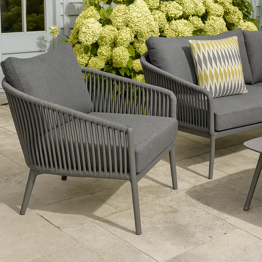 Create a sophisticated outdoor sanctuary with the Urban Weave Collection, a contemporary 4-piece rope lounge set designed for comfort and style. This premium set features a spacious 2-seater sofa, a cozy single lounge chair, and a sleek 2′ x 3′ coffee table, making it perfect for garden gatherings, balcony lounging, or patio relaxation. The tightly hand-woven rope detailing combined with cushions offers both elegance and ergonomic support.