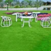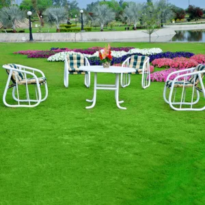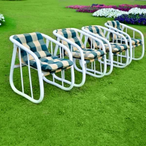 Verdana Chair set Enhance your outdoor living with this stylish and durable 5-piece garden furniture set, consisting of four cushioned chairs and a 36″ round dining table. Designed with comfort and elegance in mind, each chair features a smooth curved frame and checkered UPVC-coated fabric cushions that stay comfortable and visually appealing even with regular use. The lightweight, weather-resistant construction ensures this set remains resilient through every season. Whether for garden brunches, backyard dinners, or relaxing with friends, this set combines luxury, practicality, and timeless outdoor charm.